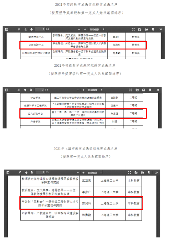 近日,上海理工大学本科生院(教务处)发布《关于2021年上海理工大学教学成果奖拟授奖成果名单和上海市教学成果奖拟推荐成果名单的公示》,公布了2021年校级教学成果奖拟授奖成果名单,计算中心共有2项教学成果获奖。其中,计算中心独立完成并申报的《基于"课-赛-练"三位一体的公共计算机创新实践平台建设》项目获二等奖,作为主要支撑单位合作申报的《学做融创、知行合一,跨学科工程创新人才实践平台建设与实践》项目获2021年上海理工大学教学成果奖特等奖。