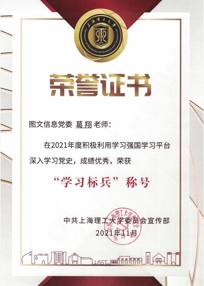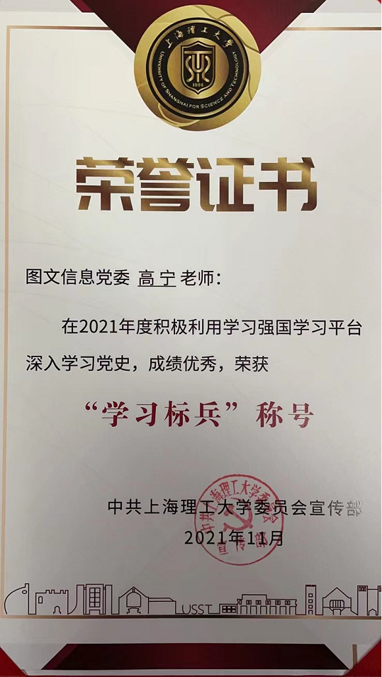 2021年11月,公共实验中心第一党支部葛翔、高宁2位同志在2021年度积极利用学习强国学习平台深入学习党史,成绩优秀,荣获由中共上海理工大学委员会宣传部颁发的“学习标兵”称号。