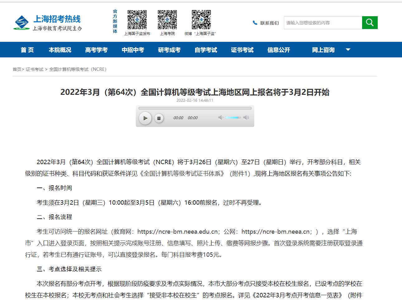 [转发]2022年3月(第64次)全国计算机等级考试上海考区网上报名将于3月2日开始