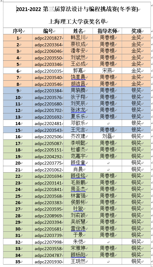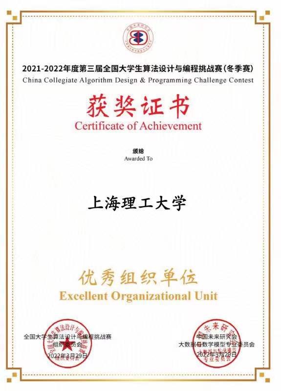3月27日,2021-2022年度第三届全国大学生算法设计与编程挑战赛完成线上赛事,我校共获得8项全国金奖、7项全国银奖,20项全国铜奖的佳绩,其中科创工坊指导学生获得全国金奖7项、银奖6项,铜奖15项,同时上海理工大学获优秀组织单位证书。