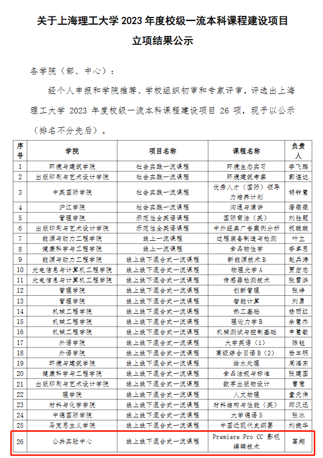 5月17日,我校2023年度校级一流本科课程建设项目立项结果公示通知发布,计算中心葛翔负责的《Premiere Pro CC 影视编辑技术》课程获批校级线上线下混合式一流课程。