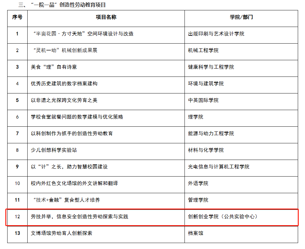 《劳技并举,信息安全创造性劳动探索与实践》获批“一院一品”创造性劳动教育项目