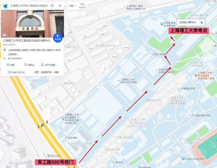 考生请从杨浦区军工路580号校门进入,校门口距考场存在一定距离,请各位考生预留充足时间,以免延误考试。