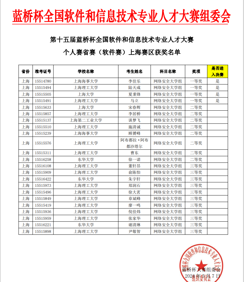 202457日,第十五届蓝桥杯全国软件和信息技术专业人才大赛(软件赛-网络安全)省赛获奖及晋级国赛的名单正式公布。我校在此次赛事中取得了骄人成绩,获上海市一等奖(晋级全国总决赛)2项、二等奖4项、三等奖9项。一等奖获奖人数、晋级全国总决赛人数、获奖总人数在上海市参赛的高校中均排名第一。