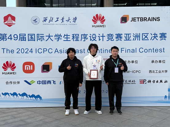 12月27-29日,第49届ACM-ICPC国际大学生程序设计竞赛亚洲区决赛在西北工业大学落下帷幕,本次大赛有北京大学、清华大学、浙江大学等东亚地区129所高校,280支队伍参赛。我校ACM战队历经亚洲区域赛杭州站、上海站选拔,最终有2支队伍获得亚洲区决赛资格。在亚洲区决赛场上,我校选手历经5个小时的激烈竞争,最终由董柯演、张皓宇、吴佳霖三位同学组成的队伍获得本次比赛银奖,刘斌然、姚陆涵茗、黄毅帆三位同学组成的队伍获得铜奖,这也是我校参加该项赛事以来,首次在亚洲区决赛中获得银奖,创下我校参加该项赛事取得的最好成绩。