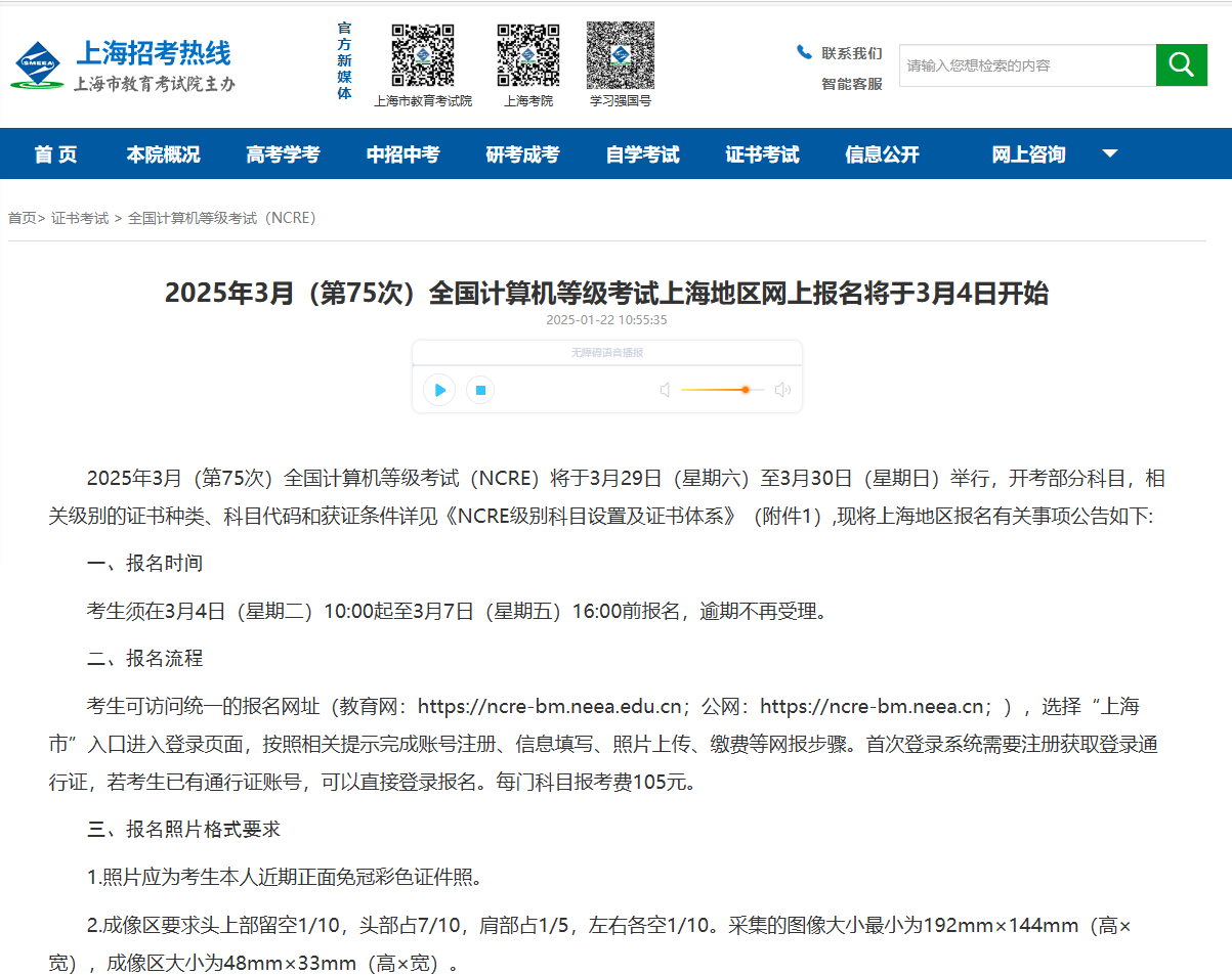 [转发]2025年3月(第75次)全国计算机等级考试上海考区网上报名将于3月4日开始